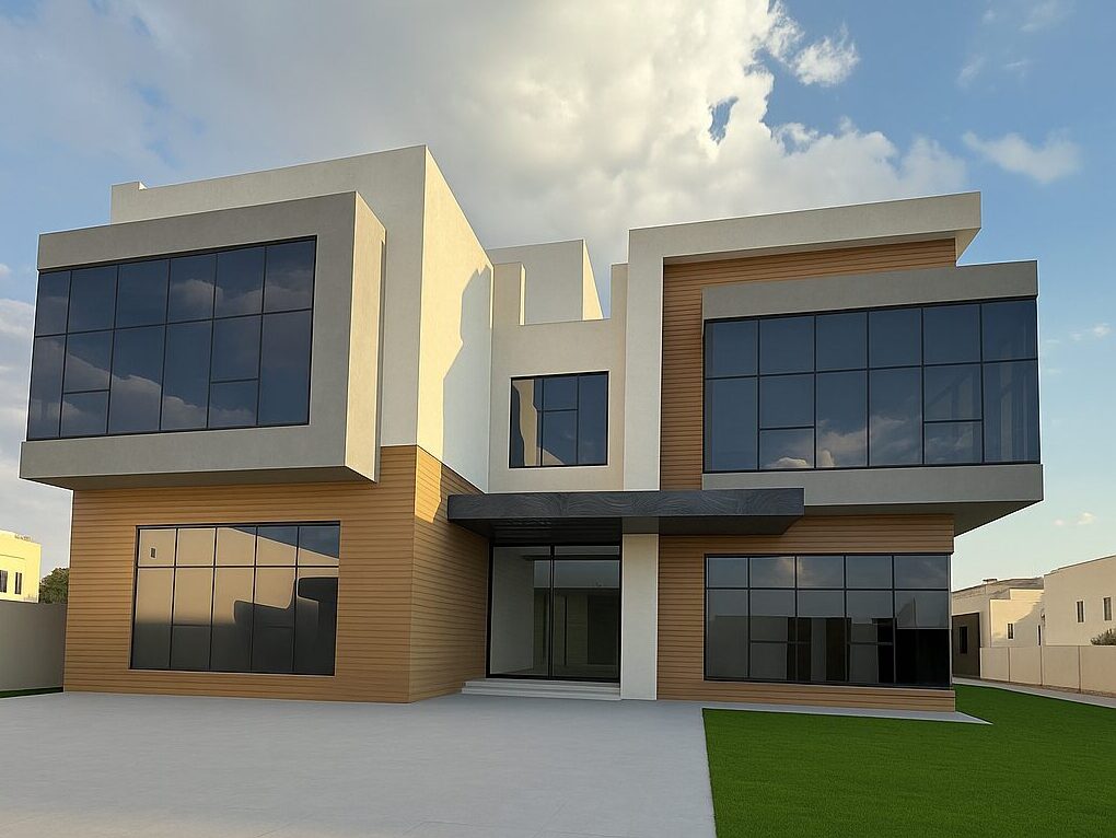واجهات بانورامية تمنح الإطلالة المفتوحة على المساحات الخارجية، مع استخدام أنظمة زجاجية توفر العزل الحراري والحماية من العوامل الجوية، مما يضفي لمسة من الفخامة والانسيابية على التصميم العام للفيلا. - نوافذ وأبواب (Windows & Doors):